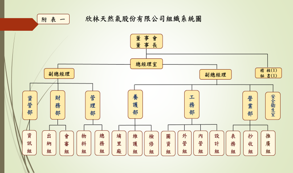 - 總經理室設副總經理二員,養護部、工務部、營業部、管理部、財務部、資管部,各部設經理一員。